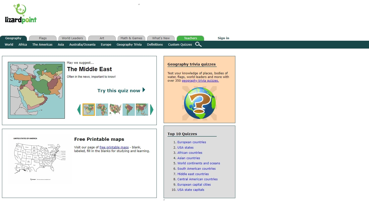If you want the best geography quizzes, Lizardpoint is a top pick. You can test your geography knowledge across different areas, including countries, continents, and various geographical features of Earth. The homepage features a list of the most popular quizzes.