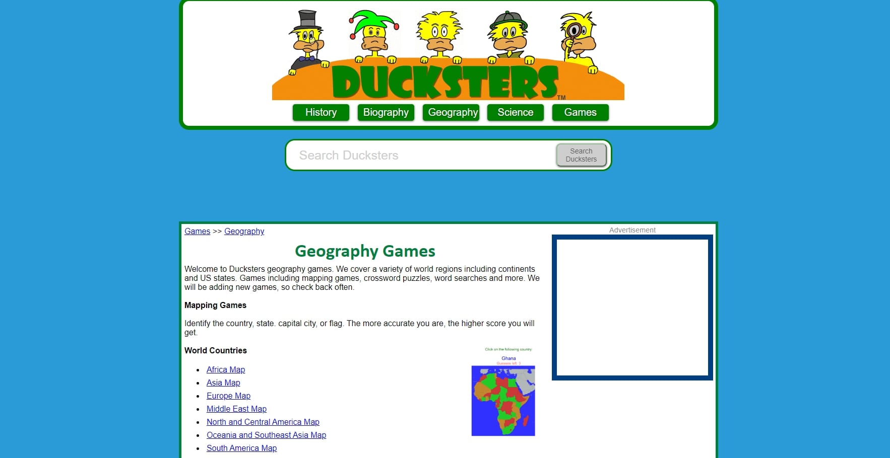 The website offers additional educational games like crossword puzzles, mapping games, and word searches. These can be played online or downloaded for offline use in classrooms. Besides geography, Ducksters also includes trivia on history, science, and biographies.